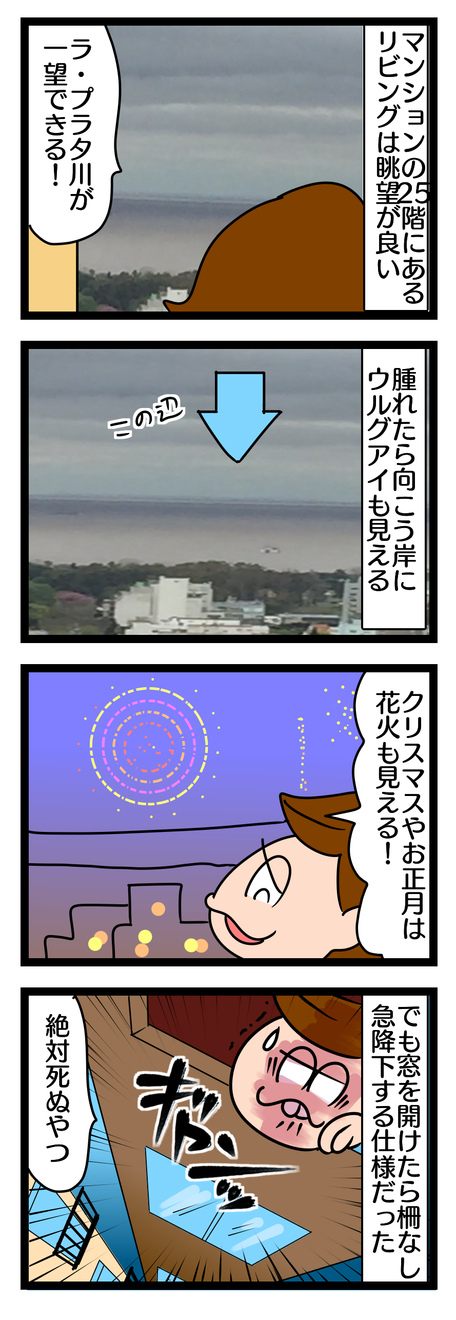 アルゼンチン生活1年目 > マンションのお部屋紹介 2020年03月11日 第109話 アルゼンチンで住んだマンションのお部屋紹介~リビングにはエンゼルフォール~あの世へつながる窓 アルゼンチンで住んだマンションのお部屋紹介。本日からはリビング編でございます。あぶらさんたちが新しく住むことになったマンションは25階。はいはいを始めた三男くんと元気いっぱいの3歳児の次男君がいるあぶら家にはありえない危険地帯…!次回につづきます。前回までのお話。他のお部屋の紹介記事はこちらから読めます♪ 応援おねがいします!バナーをクリックすると当ブログにランキングの1票が入ります♪(いつもありがとうございます!)にほんブログ村 スポンサードリンク 「アルゼンチン生活1年目」カテゴリの最新記事 前の記事: 第108話 アルゼンチンで住んだマンションのトイレが詰まる原因を分析した結果 次の記事: 第110話 アルゼンチンで住んだマンションのお部屋紹介~リビングの窓が羅生門すぎた結果できた夫婦の目標 コメント コメントフォーム 名前 コメント 記事の評価 リセット リセット 顔 星 情報を記憶 コメントを投稿する
