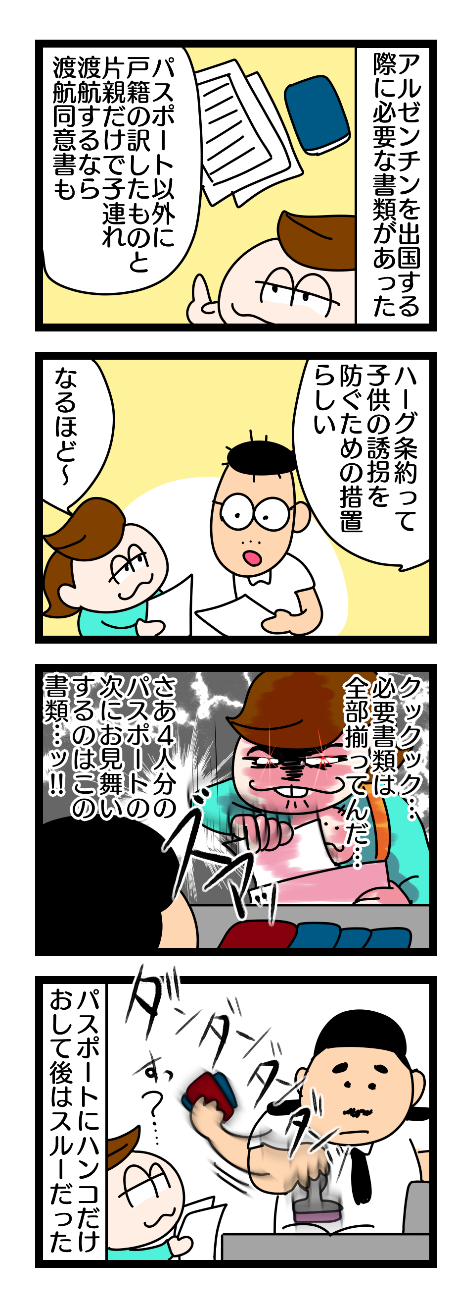 アルゼンチン生活1年目 > 一時帰国 2020年04月29日 第144話 片親だけで国外へ出る時に必要な書類を揃えて出国審査したものの… アルゼンチンから出国する際に、片親だけで子供を連れて行く場合にはパスポート以外にも必要な書類があるといわれていました。4人分のパスポートを出して、そのあと意気揚々と準備した書類を出そうとしたらおじさんはパスポートだけハンコをおしてあっさりと通してくれました。なんだか思ってたんと違う…。無事に出国できたから良いのですが。次回につづきます。前回までのお話。応援おねがいします!バナーをクリックすると当ブログにランキングの1票が入ります♪(いつもありがとうございます!)にほんブログ村 スポンサードリンク 「アルゼンチン生活1年目」カテゴリの最新記事 前の記事: 第143話 偏差値35妻~一人で子供3人連れて飛行機の旅!アルゼンチンから一時帰国 次の記事: 第145話 アルゼンチンから一時帰国~子供3人連れて12時間経由地ドイツまで飛行機に乗る! コメント はっさく |2020年04月29日 08:37 はじめまして。 1年という短い期間でしたが、アルゼンチンのお隣のブラジルにいたので、とても懐かしい気持ちで読ませていただきました。 私も英語が苦手でGoogle翻訳片手に四苦八苦した思い出です。 子供のクラスメイトに、日本語英語ポルトガル語ペラペラの子がいてその子に助けてもらったこともありました(^◇^;) 他にも、生活スタート当初、洗濯機の不具合で脱水ができず一枚一枚しぼったり、バルコニーに謎の虫が大量発生したり…。 色々ありましたが、全部いい思い出です。 こちらのブログを読んでいるとそれを思い出せて、自粛生活も少し気を紛らわせることができるので感謝しています。 ありがとうございます。 これからも更新を楽しみにしていますね。 あぶら |2020年04月29日 13:15 >>1 はっさく様 はじめまして。コメントありがとうございます。 ブラジルですか!お隣の国という事で、噂はちらほら聞いておりました。言葉の問題は、誰か助けてくれる人がいると、ほんと、心強いですね。そして、洗濯機(特に脱水)はねぇ、虫もねぇ、ほんと、苦労しました。ほんと、頑張りましたね、私達^ ^ 自粛生活が長引きますが、私の体験で笑っていただければ、とても嬉しいです。 今後もぜひお楽しみ下さい♪ コメントフォーム 名前 コメント 記事の評価 リセット リセット 顔 星 情報を記憶 コメントを投稿する