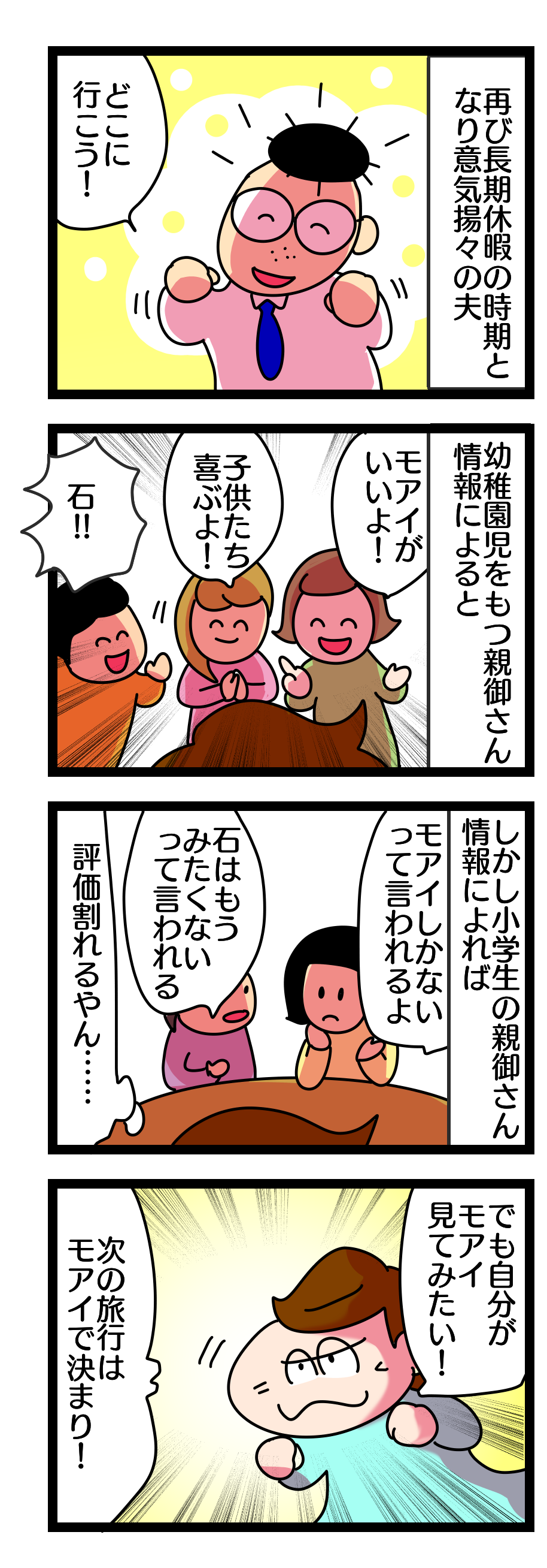 旅行・お店 > イースター島・チリ 2021年03月05日 327話 海外駐在生活!長期休暇次の行き先は……モアイ? 恒例の長期休暇の時期になり、あぶらさんのご主人はどこにいこうかウキウキです。さて次の旅行先はどこになるのでしょうか。というわけで、幼児受け?するというモアイをみに行くことに決定!次回に続きます。前回のおはなし過去の旅行記などはこちらから読めます。 応援おねがいします!バナーをクリックすると当ブログにランキングの1票が入ります♪(いつもありがとうございます!)にほんブログ村 スポンサードリンク 「旅行・お店」カテゴリの最新記事 前の記事: 326話 海外駐在生活!偏差値35妻、時を経てフィーバーの本当の意味を知る 次の記事: 328話 海外駐在生活!長期休暇の子連れ旅行でイースター島へ!チリのサンティアゴからの距離は? コメント コメントフォーム 名前 コメント 記事の評価 リセット リセット 顔 星 情報を記憶 コメントを投稿する